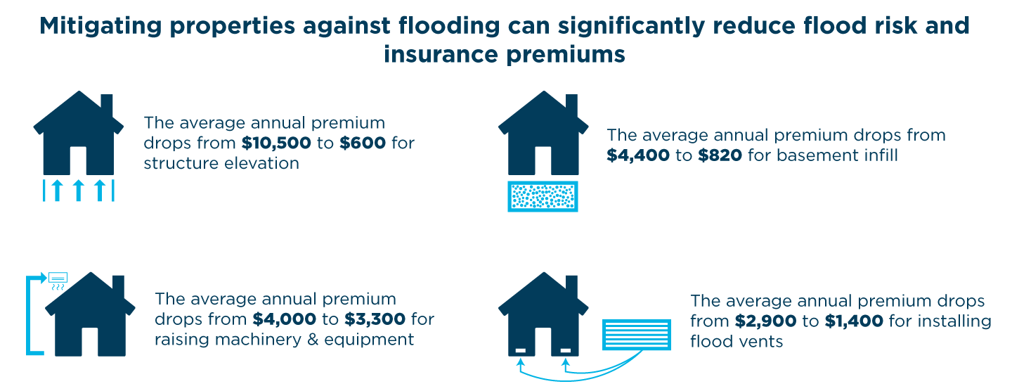 Because mitigation efforts to properties — such as elevating a building or installing proper flood openings in a crawlspace — help reduce flood damage, FEMA incentivizes such efforts with reduced premiums for NFIP policyholders. One study found that for elevating a structure in New York City, the average annual premium drops from $10,500 to $600; for basement infill, premiums can drop from $4,400 to $820.