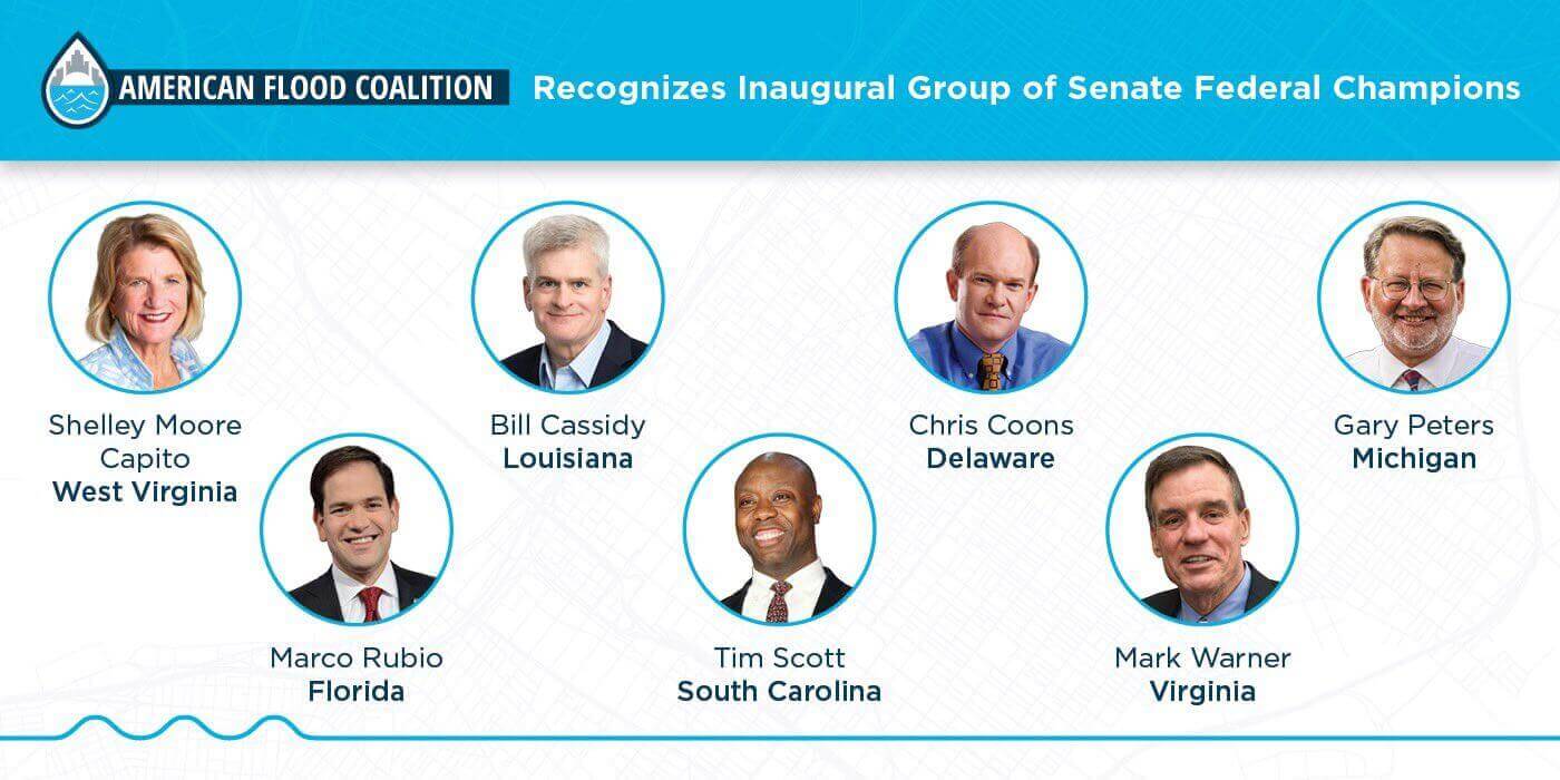 This year, we announced our first Senate Federal Champions, who joined over two dozen bipartisan Federal Champions in the U.S. House of Representatives. Recognized for their leadership, public service, and commitment to finding proactive solutions to the challenges posed by flooding, Sens. Shelley Moore Capito (WV), Bill Cassidy (LA), Chris Coons (DE), Gary Peters (MI), Marco Rubio (FL), Tim Scott (SC), and Mark Warner (VA) will inform and enhance our Coalition’s work in both chambers of Congress.