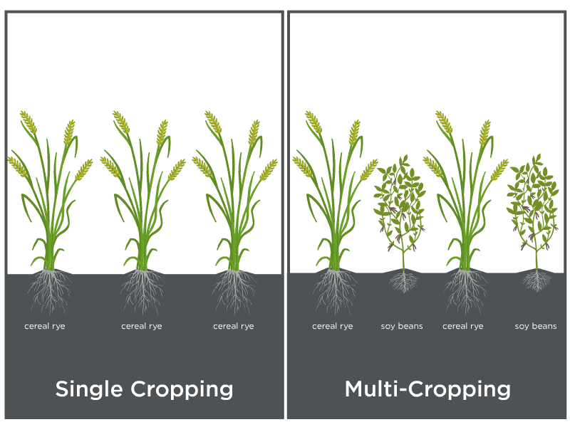 - Compared to an adjacent corn field using a traditional one crop system, multi-cropping doubles the rate by which water infiltrates the soil.