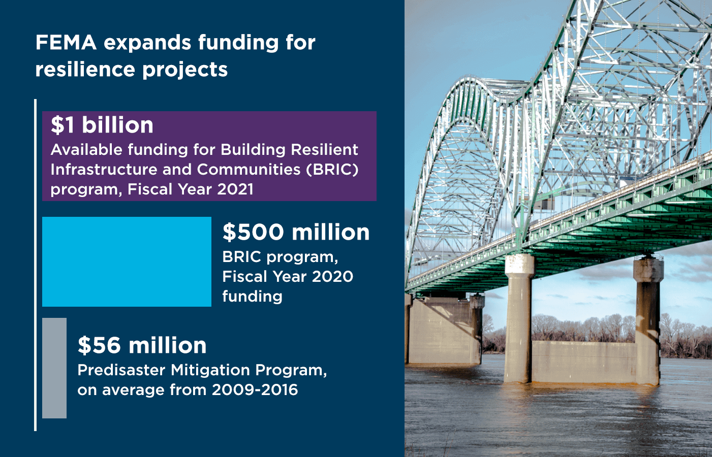 Before we dive in to how to apply, let’s review the basics of FEMA’s Building Resilient Infrastructure and Communities (BRIC) program. Launched in 2021, the BRIC program is a way for states and communities to jumpstart resilience projects.